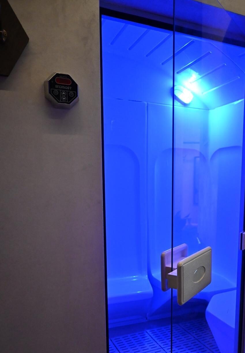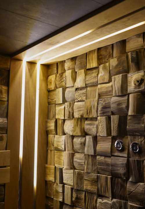 Die Finnische Sauna verfügt über elektronische Zugabe von Aufguss und Aromen per Knopfdruck.